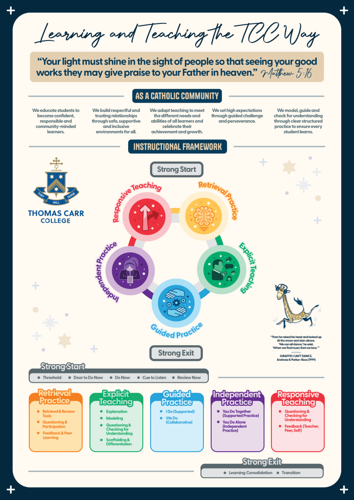Faith, Learning and Wellbeing are at the heart of who we are as a dynamic Catholic learning community. Learning and Teaching the TCC Way affirms that students flourish when their spiritual, academic and personal growth are nurtured together. We recognise that learners thrive when they feel safe, supported and known, and when their classroom environment offers consistent, predictable routines, high expectations and genuine care grounded in our Catholic mission.