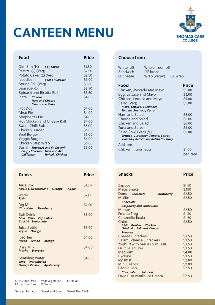 A range of healthy food, both hot and cold, are available. The menu is updated regularly to ensure that we offer a wide range of foods for our students.